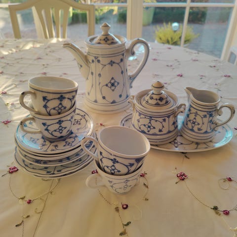 Farvepaletten har varme gyldne nuancer med indslag af turkis, kobaltblå, hvid og sort, hvilket skaber en livlig, men afbalanceret sammensætning. Alle stykker viser omhyggelig håndmailering med ensartede mønstre gennem hele sættet.
