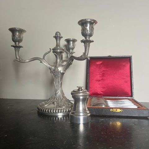 Smuk verzilverd jardinière på en åbnet ramme i Louis XVI-stil med to saltkar og tilhørende skeer. Denne elegante jardinière blev fremstillet i verzilverd metal med indlæg af dyb kobaltblå glas. Den rektangulære ramme hviler på fire elegant buede ben, der ender i løvefødder og er kronet med fine grotesker. Disse motiver er hentet fra den klassiske oldtid og genopstod under Napoleon III-perioden (1850-1870). Hele værket er rigt dekoreret med klassiske ornamenter, herunder guirlander, acanthusblade og en centralt placeret sløjfe, som er et typisk kendetegn for Louis XVI-stilen.