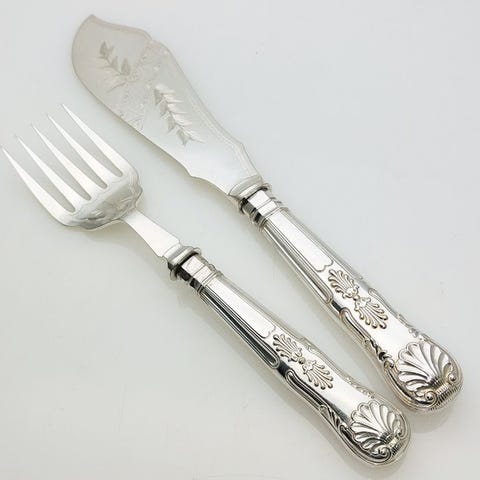 Meget smukt Art Deco, stor størrelse, sølvbelagt 2-delt fisk- serveringsbestik, bestående af en fiskekniv (29,5 cm) og en fisk- serveringsgaffel (22,5 cm).