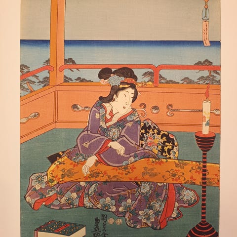 Denne elegante bijin-ga-tryk, med titlen «Nanigataki Miyo no Gakai-e (難有御代ノ賀界絵)», blev designet af Utagawa Kunisada, en af de førende mestre inden for ukiyo-e.