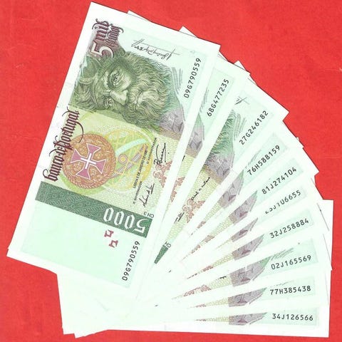 5 stk. 10000 escudo-noter fra Portugal, Infante D. Henrique, CH 2, dateret 1996–1998, alle i ny tilstand. Klik på den blå "gå til varen" knap, for at købe eller byde på denne vare. Den samlede pris vil blive vist inden du afgiver dit bud.