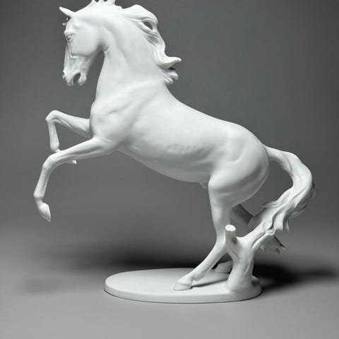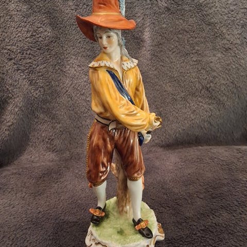 Denne fascinerende porcelænsstatuette forestiller kejser Napoleon I på sin hest, klædt i den berømte uniform og den to-pudede hat. Figuren har en bemærkelsesværdig kunstnerisk værdi og er detaljeret, med særlig opmærksomhed på klæderne og hestens muskulatur.