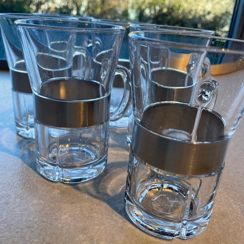 Rosendahl glaskrus med hank og metalbånd, indeholder 25 cm. Glassene er gennemsigtige og har en rund hank for nem håndtering. Metalbåndet omkring glasset tilføjer et dekorativt element. Velegnet til servering af varme og kolde drikke. I ok stand, ingen hakker eller ridser. Samlet pris for alle 4.