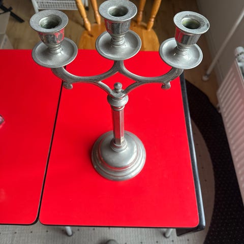 Tinlysestage, 4 arme, plads til 5 lys. Armene er mobile og kan dreje