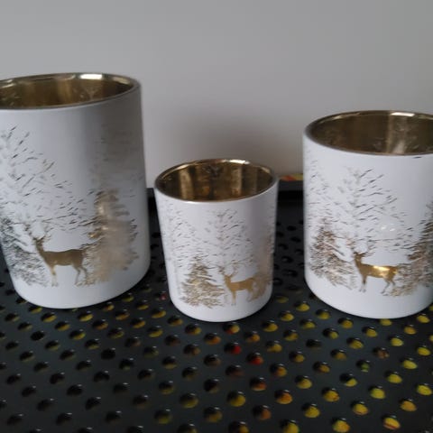 2 stk. rigtig pæne keramik fyrfadsstager, røde med guld motiv H 6 cm Ø 7,5 cm