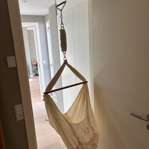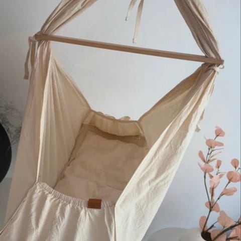 Membantu slyngevugge til børn lavet i cremefarvet stof. Er nyvasket og fungerer fint.