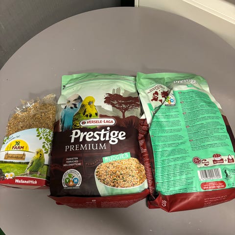 Undulatfoder fra jr farm 3 stk af 1 kg. Købt for nyligt. 7 pk med stænger fra vitakraft - gælder til september 2027. En stor pose hilser - købt for nyligt.