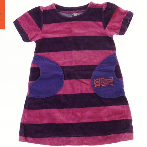 Kjole til børn med korte ærmer i lilla og lyserøde striber. Kjolen har to lilla lommer foran og et Katvig-mærke på den ene lomme.
