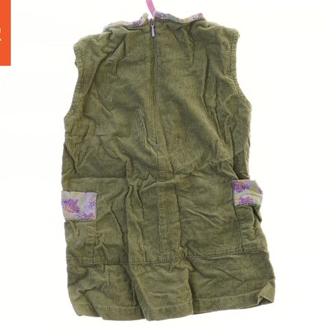 Ærmeløs buksedragt lavet af grøn fløjl. Dragten har lilla og blomstrede detaljer på lommerne og langs toppen af knappestolpen. Den lukkes med en lynlås på bagsiden og har dekorative knapper på forsiden.