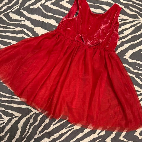 Kjole med røde og hvide tern. Kjolen har knapper på bagsiden og en dekorativ blondekant. Den er ærmeløs og har en rund halsudskæring.