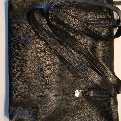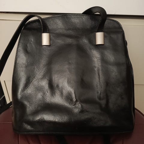 Dette er en sort skuldertaske lavet af læder. Tasken har en justerbar skulderrem og en lynlås til at lukke hovedrummet. Der er en udvendig lynlåslomme på bagsiden af tasken til hurtig adgang til småting. Størrelsen på tasken er 25x30 cm.