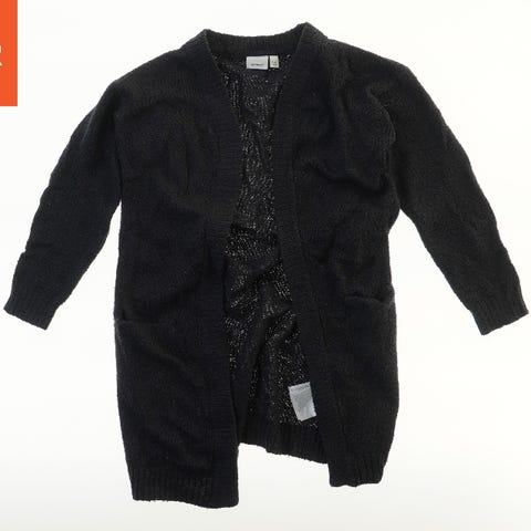 Denne cardigan er lavet af lilla strikstof med et fint åbent mønster, der giver et elegant udseende. Den har lange ærmer og små knapper på forsiden, som gør det nemt at åbne og lukke. Ribbekanterne på ærmer og nederste kant tilføjer stil og komfort.