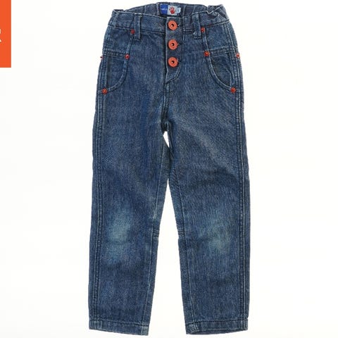 Disse børnejeans er lavet af blå denim materiale med synlige røde syninger. De har elastisk talje og bæltestropper, samt to forlommer med knapdetaljer. Der er også to baglommer med knapdetaljer. Nederst på hvert bukseben er der to knapper fastgjort med røde syninger for ekstra stil.