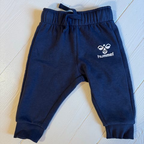 Et par børne joggebukser i sort farve med et dekorativt logo trykt på forsiden. Bukserne har en elastisk talje med snørejustering for komfort. Designet viser en meleret tekstur, og stoffet ser blødt og behageligt ud.