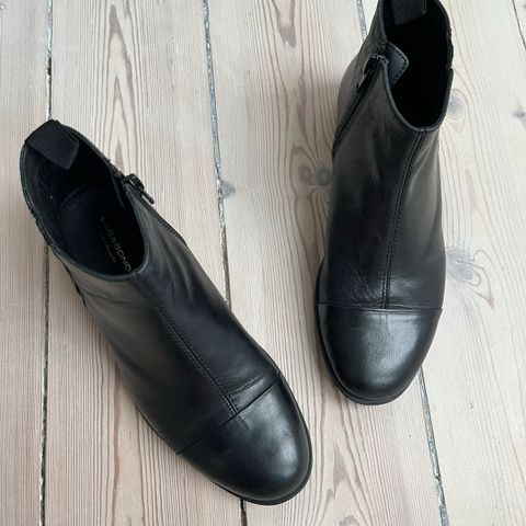 Denne sorte læderstøvle er en ankelhøj chelseastøvle med elastiske paneler på siden og en lille hælstrop for nemt at trække støvlen på. Støvlen har en blokhæl og en spids snude, hvilket giver den et elegant udseende. Den er i størrelse 40 og er lavet af skinnende sort læder, hvilket kan ses på på billederne.