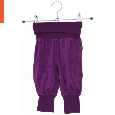 Par mørkeblå fløjsbukser til børn, med elastisk talje og knaplukning foran. Bukserne har flere lommer, inklusive to store lommer på siderne med flap og to baglommer. Fløjlsmaterialet giver en blød tekstur.
