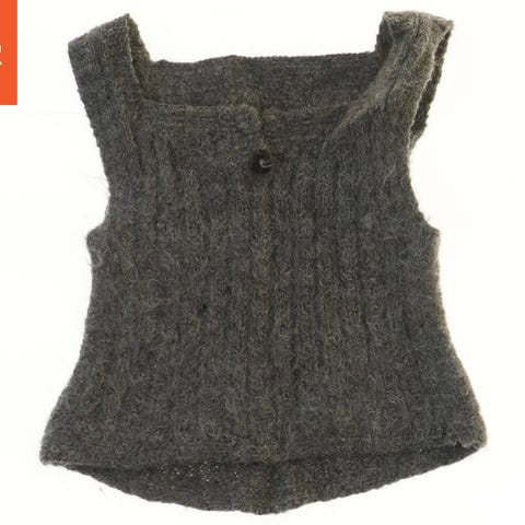 Denne børne vest er lavet af et let polstret materiale og har en quiltet struktur. Den har en ribkant ved hals og talje, og to lommer foran med dekorative knapper. Farven på vesten er lilla.