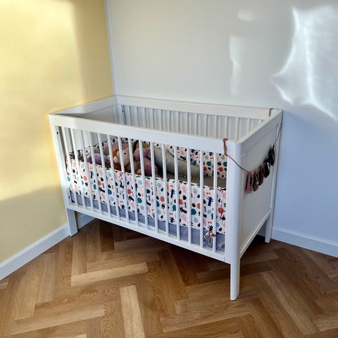 Tremmeseng med Madras i god kvalitet. Længde 126 cm bredde 68 cm højde 90 cm der er flere justerings muligheder med bunden. Madrassen fra Baby Sam, er i purskum og er brandhæmmende.