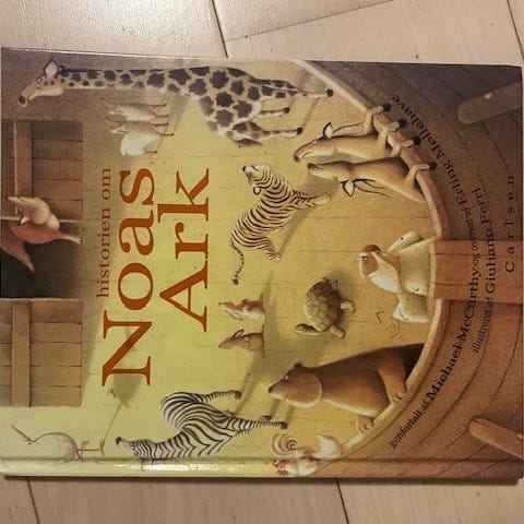 Noahs ark i træ med forskellige dyr med som løver, tigere, elefanter, giraffer osv.
