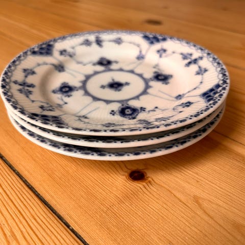 Kagetallerkener fra Royal Copenhagen, musselmalet riflet, mønster 181. Diameter 15½ cm. 2. sortering. Har 8 tallerkener. Stykpris 90 kr.