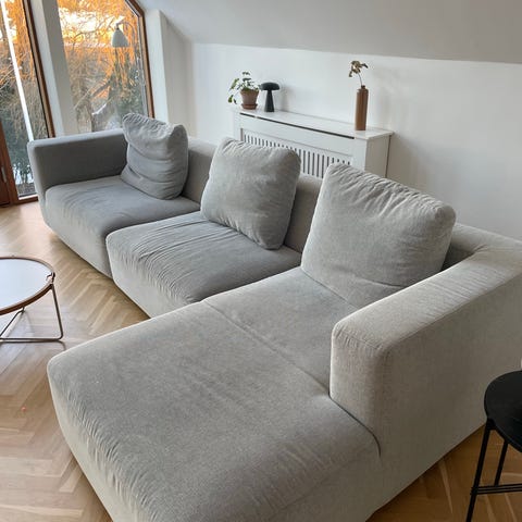 Alt i alt pæn stand, enkelte brugsspor (se billeder). Ikke udsat for kæledyr eller rygning. Chaiselongen kan hægtes af for lettere transport. Nypris: 8000 kr. Står på 2. sal.