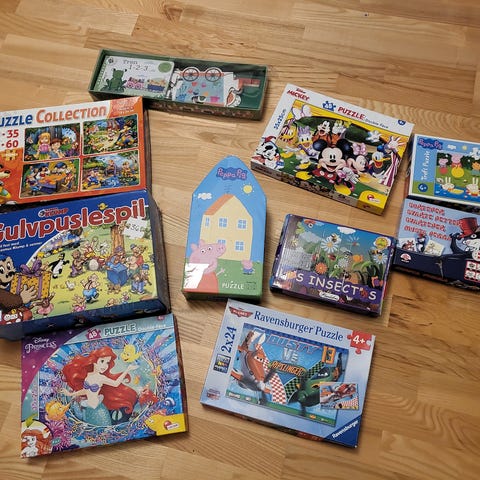 To puslespil i én boks med 24 brikker hver. Alle brikker er der. Brikkernes bagside angiver hvilket af de to puslespil, som det tilhører