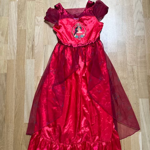 Denne udklædningskjole til børn er lavet i en lys gul farve. Kjolen har tynde stropper og detaljer som inkluderer røde rosetter foran. Skørtet er fyldigt med flere lag og giver volume til kjolen. Der er blonde detaljer på flere steder, som tilføjer et elegant touch.
