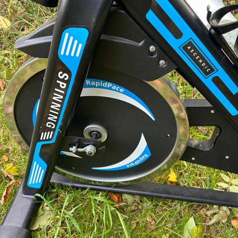 Spinningcykel i hvid med rød svinghjul. Cyklen har justerbart sæde og styr, samt pedaler med stropper. Egnet til indendørs træning og konditionstræning