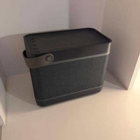 Bang & Olufsen bærbar højttaler i grå farve med bærehåndtag i læder. En kompakt enhed designet til lydafspilning med trådløs funktionalitet.
