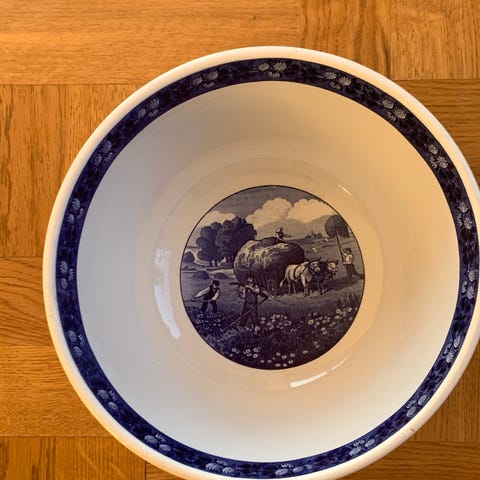 Ældre keramikkrus med en højde på 6,5 cm. Det har en lyseblå farve med et gult plastlåg mærket ‘UG’ (måske sennep?). På bunden er der en logoindgravering fra Villeroy & Boch, som angiver, at det er lavet i Tyskland. Kruset kan bruges til opbevaring af små mængder væske eller som en dekorativ beholder.
