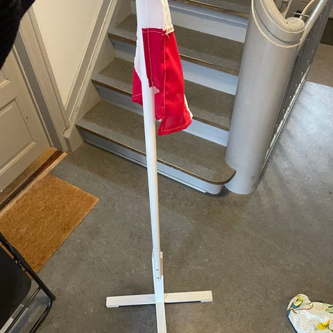 Objektet er en mini flagstang, der bærer det danske Dannebrog. Flaget er rødt med en hvid kors, klassisk for det danske nationalflag. Flagstangen er hvid med en rød top og står på en lille rød fod. Størrelsen er 30 cm i højden.