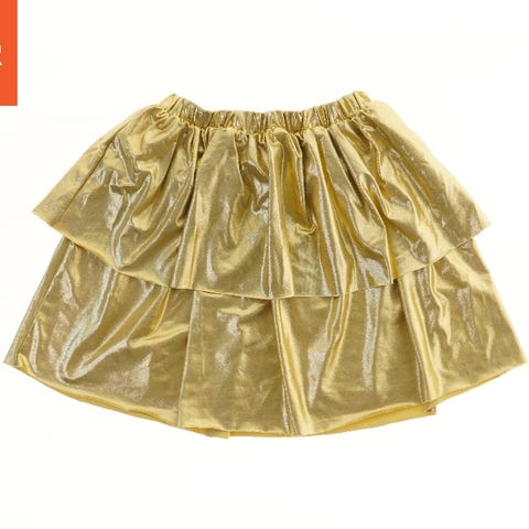 En plisseret nederdel i en skinnende guld farve med elastisk linning. Materialet har en tekstureret overflade, der skaber fine folder og giver et elegant look.