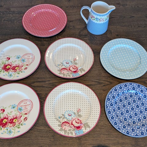 Greengate tallerkner fra udgået serie . Den ene tallerken har et lille skår på bagsiden.Sættet består af seks tallerkener med et dekorativt mønster af blå og røde striber langs kanten. Tallerkenerne er velegnede til almindelig brug i køkkenet.sælges for 200kr