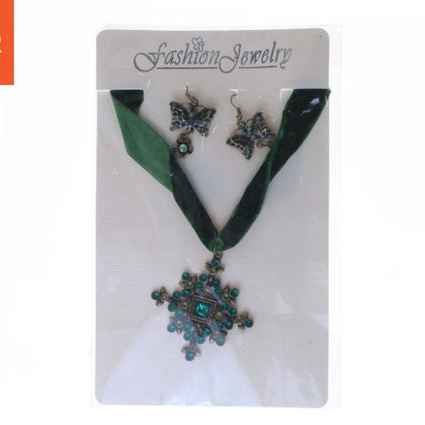 Denne smukke halskæde har grønne blomster og sommerfugle dekorationer. Den er lavet af metal med en kædelængde på 50 cm. Der medfølger også matchende ørestikker, dekoreret med grønne blomster og perler. Størrelsen er 50 cm for halskæden og 35 mm for ørestikkerne.