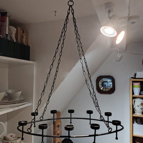 Del til en krystal lysekrone. Produktet inkluderer en cylindrisk sektion med flere krystaldetaljer, påført på en metalbase med tilslutninger, samt løse krystal stykker og skruer. Størrelse: 20x15 cm. Tags: krystal, lysekrone