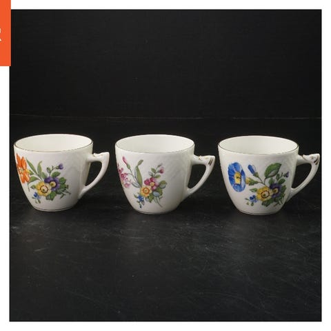 Saksisk Blomst kaffekop, dekoreret med forskellige blomster på creme bund, og med guldkant.
