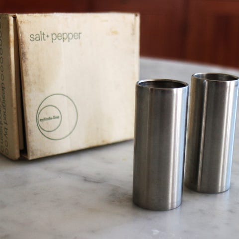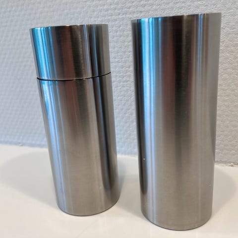 To sæt salt/peber Cylinda line - saltbøsser og peberkværne designet af Arne Jacobsen. Den ene peberkværn har et eller andet med gevindet - så den ikke rigtig kan skrues fast - kan sikkert nemt fixes af en handymand. Samlet pris - altså for alle fire