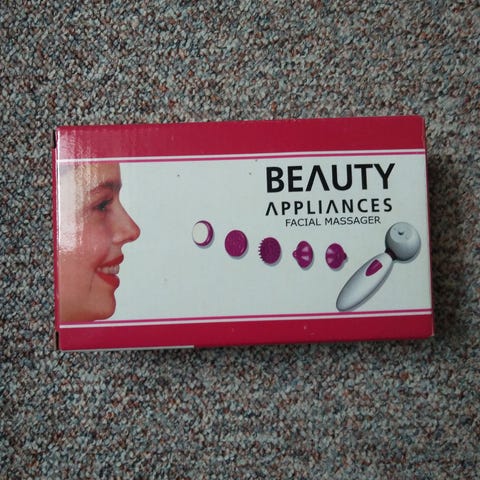 Dette er et ansigtsmassagesæt, der inkluderer en massage enhed med to udskiftelige hoveder: en med børste og en med massageknopper. Enheden har en simpel on/off-knap og er designet til at forbedre ansigtspleje ved at tilføje massage og blid eksfoliering med den elektriske børste. Den kompakte størrelse gør den nem at håndtere og ideel til daglig brug.
