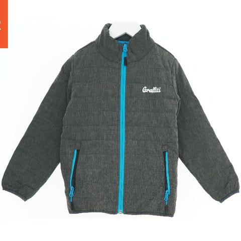 Jakke fra Weather Report med hætte og lynlås. Jakken har to forlommer med lynlåse og elastiske manchetter. Farven er primært blå, og den har et lille refleksbånd på bagsiden i bunden.