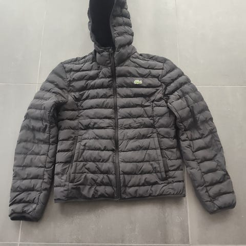 Jakke med hætte. Den har farvede paneler i hvid, blå og rød. Foran er der en lynlås og lommer med lynlås. Lacoste's logo er på brystet og 'LACOSTE SPORT' er skrevet på ryggen.