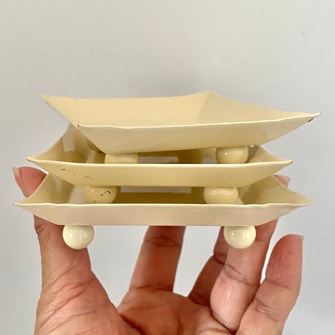 En to-etagers etagere i guldmetal. Den har to runde skåle, en større nederste skål og en mindre øverste skål, der begge er fastgjort til en midterstang med en topknop. Dimensionerne er 20x12 cm, hvilket gør den kompakt og passende til opbevaring af små genstande eller servering. Branded som H&M Home.