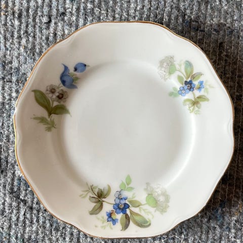 Dette er et sæt af seks små porcelænstallerkener med en diameter på 16 cm. Tallerkenerne har en cremefarvet base og er dekoreret med brune motiver, samt en sølvfarvet kant. Billederne på tallerkenerne fremviser botaniske elementer og er placeret symmetrisk langs kanten af tallerkenen. På bagsiden af hver tallerken er der en trykt stempel, som kan indikere producentens mærke.