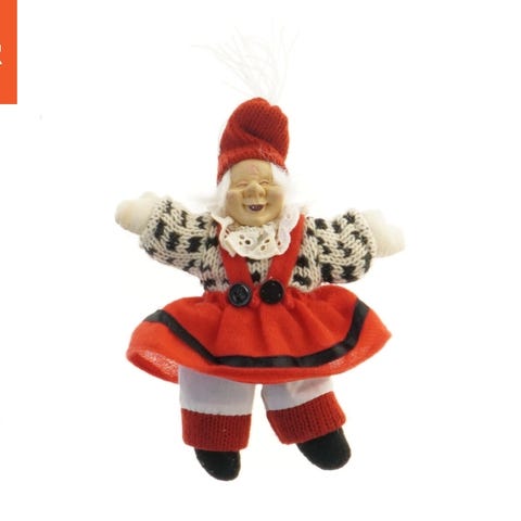 Denne juledukke er iført et traditionelt rødt kostume med en grå forklæde dekoreret med et hjerte. Dukkens tøj inkluderer en rød hue, stribede strømpebukser og fletskosko lavet af strå. Juletemaet er tydeligt i designet, og dukken kan være en del af juledekorationer eller som en samlergenstand.