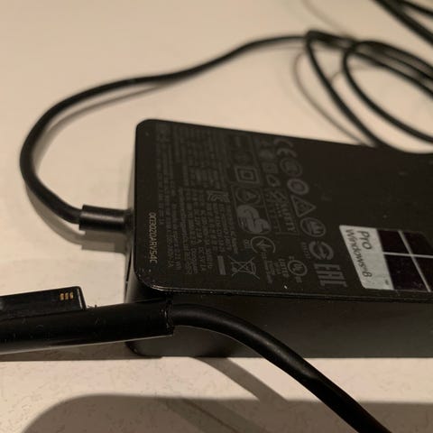 Green Cell strømforsyning kompatibel med Microsoft Surface Pro 3, Pro 4 og Pro 5. Output: 15V/4A, 65W. Farve: sort. Medfølgende kabel tilsluttes Surface-enheden via magnetisk stik.
