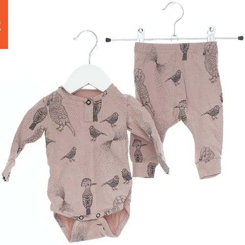 Babysæt bestående af en hvid bodystocking med lange ærmer, pyntet med et print af en ræv og fugl, samt en grå heldragt uden ærmer. Heldragten har print af en snegl og en dør. Begge dele har knaplukning ved bunden.