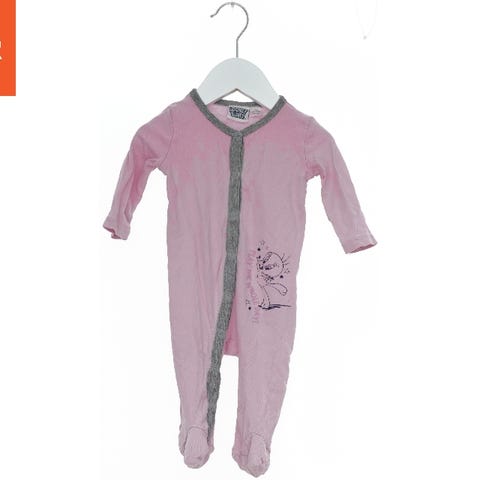 Heldragt i lyserød farve med lange ærmer og fødder. Designet inkluderer et gråt panel langs knapperne og et print af en kat på den ene side af dragten. Lavet af behageligt materiale. Størrelsen er 62 og passer til små børn.