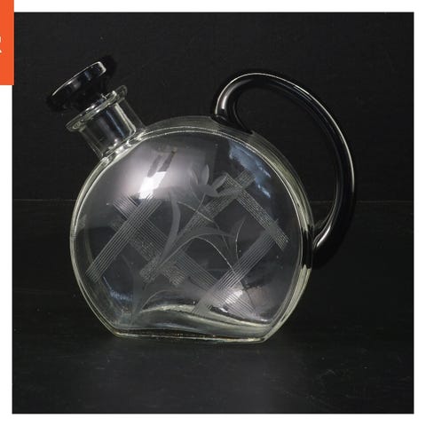 Holmegaard glaskaraffel med en rund, sort prop. Karaffelen har en indgraveret blomst og krydsmønster på ydersiden, hvilket giver den et dekorativt udseende. Den er ideel til servering af spiritus eller vand. Størrelsen er 18 cm i højden.