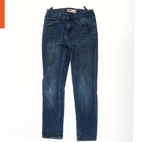Et par blå Levi's jeans med elastisk talje, to forlommer, to baglommer med synlige stikninger samt bæltestropper.