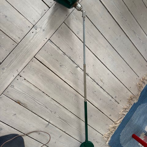 Vintage væglampe med en længde på 67 cm og en bredde på 30 cm. Lampen har en rustik, sort overflade med tydelige tegn på brug. Lampens arm er justerbar, hvilket gør den ideel til at rette lys mod forskellige områder. Den har en elektrisk ledning, men der er ingen pære inkluderet.