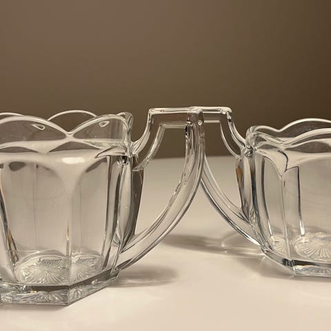 Dette sæt består af to blå glasobjekter i forskellige størrelser, smukt indrammet i en kobberholder. Den største, en skål, har en diameter på 10 cm og den mindre, en kande med hank, har en diameter på 5 cm. Kobberholderne tilføjer en elegant kontrast til det klare blå glas.